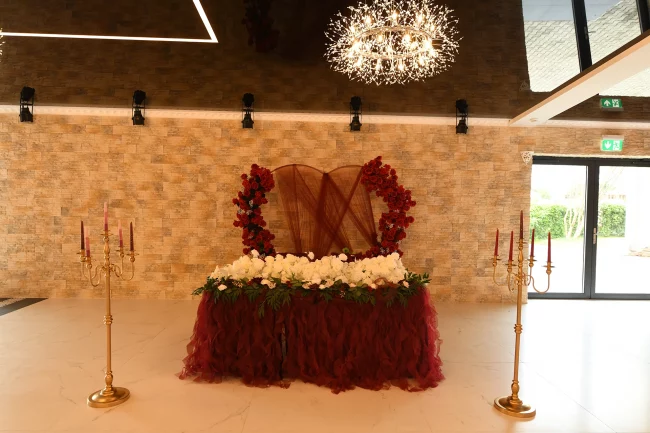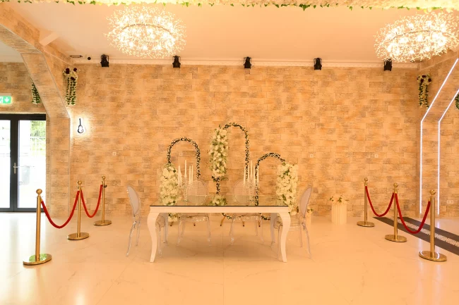 Ein eleganter Bereich für Verlobung, Trauung oder Nikah-Feier – umrahmt von hochwertigen floralen Bögen und stilvoller Beleuchtung.